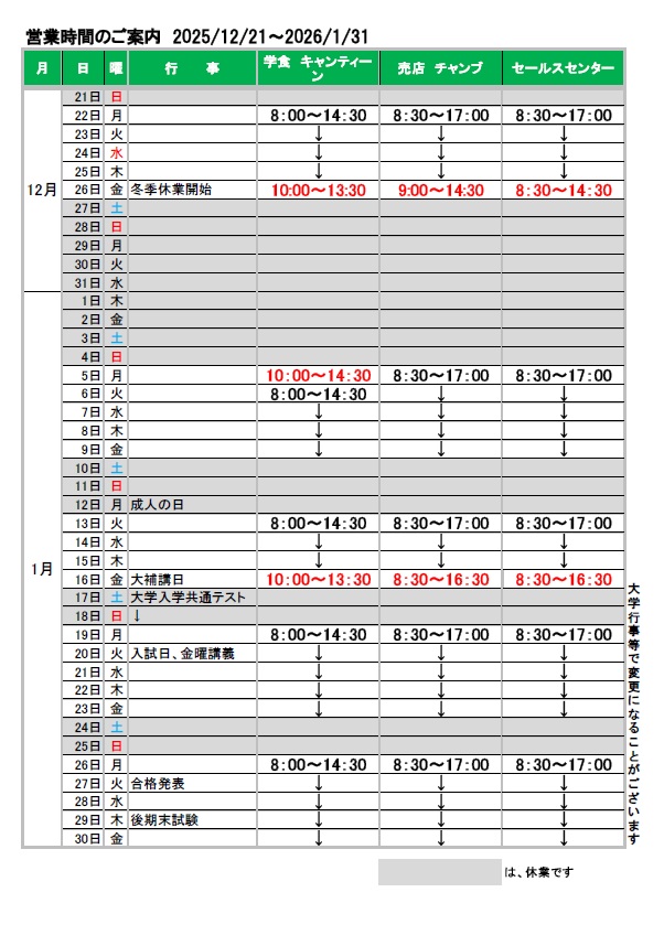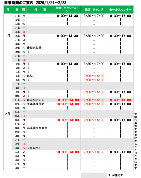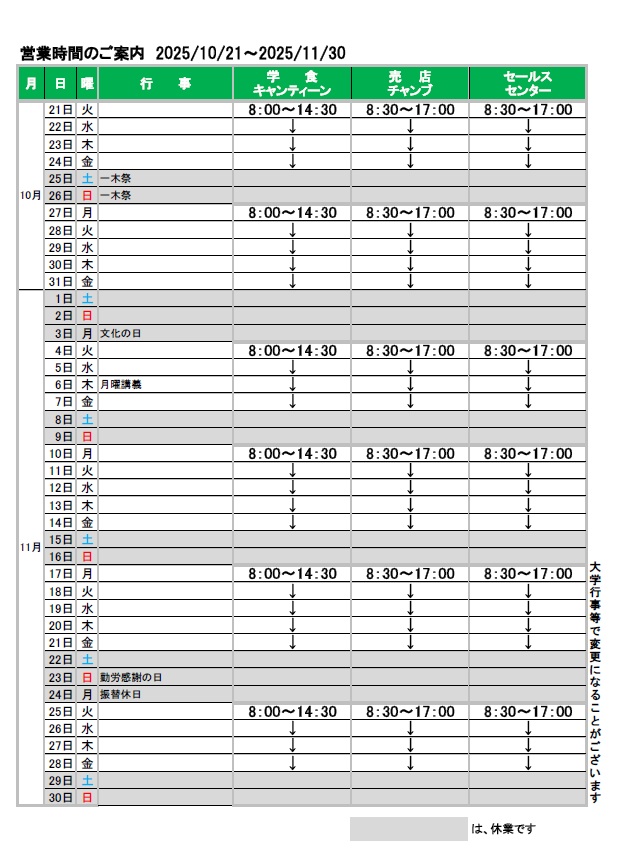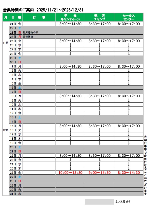 学食キャンティーン、売店チャンブ、セールスセンターの営業予定
