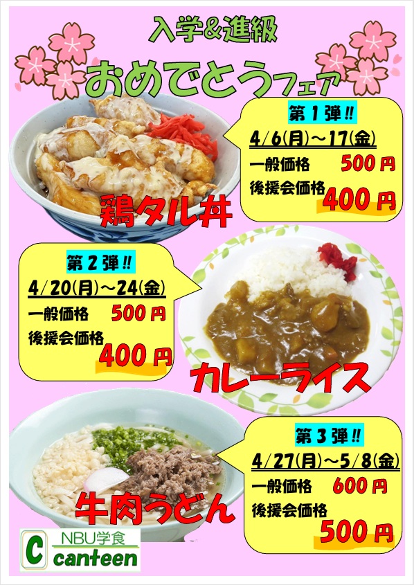 学食替わりメニューと今月のフェアのご案内です。