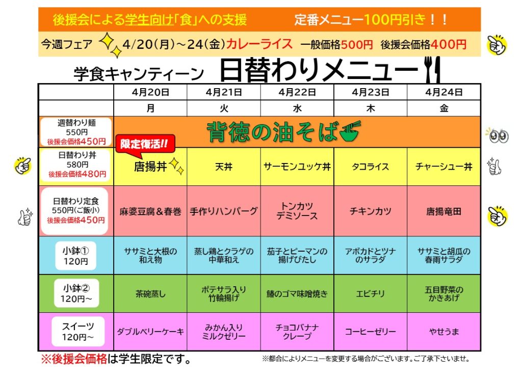 学食キャンティーン 週間メニュー